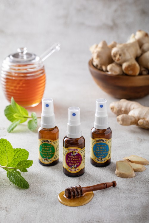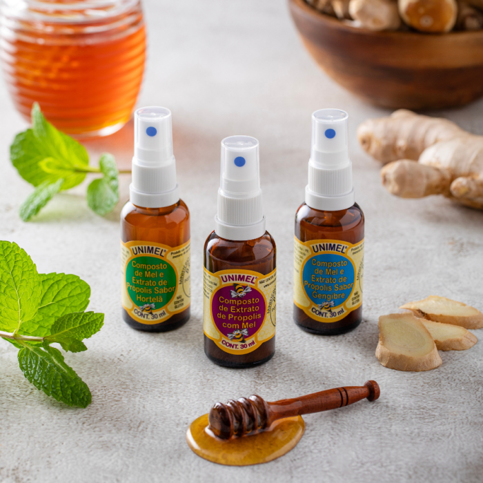 O spray de própolis com mel, tem em sua composição extrato de propolis e mel, para o uso tópico na região bucal, auxiliando nas dores de garganta e baixa imunidade, seu sabor é adocicado devido a adição de mel, este é o seu maior aliado durante uma gripe, dor de garganta ou tosse persistente.