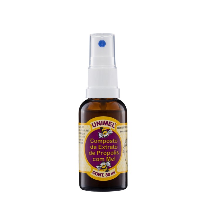 O spray de própolis com mel, tem em sua composição extrato de propolis e mel, para o uso tópico na região bucal, auxiliando nas dores de garganta e baixa imunidade, seu sabor é adocicado devido a adição de mel, este é o seu maior aliado durante uma gripe, dor de garganta ou tosse persistente.